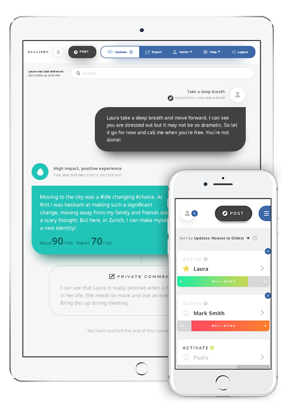 Designed for Coach Practitioners and Mentors, RealifePortal integrates with the RealifeChange app and helps you stay connected with your clients’ journey. Visualise your client’s Well-being, mood and life impact on a daily basis, then help guide them towards improvements and self-growth!